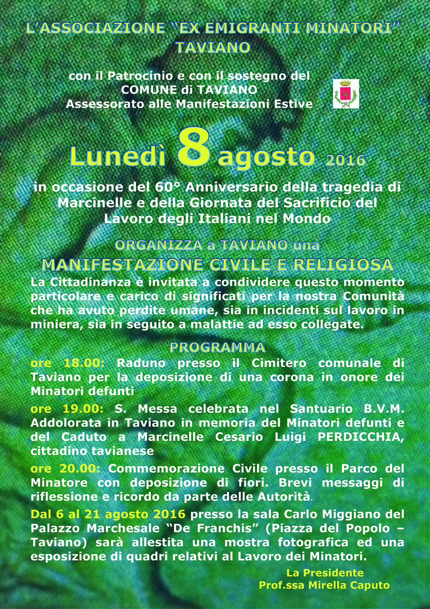 In occasione del 60° anniversario della tragedia di Marcinelle e della Giornata del Sacrificio del Lavoro degli Italiani nel Mondo, l'Associazione ex Emigranti Minatori organizza a Taviano una manifestazione civile e religiosa.La Cittadinanza è invitata a partecipare.Visualizza la relativa locandina informativa