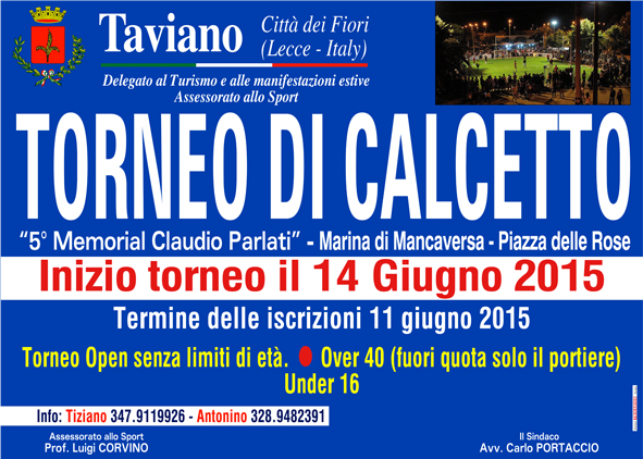 MANCAVERSA - piazza delle rose - il 14 giugno 2015 inizia il "Torneo di Calcio a 5" Memorial Claudio Parlati quinta edizione. Termine iscrizioni: 11 giugno p.v.