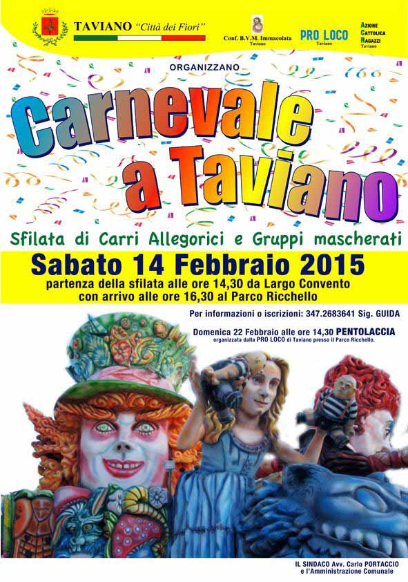L'Amministrazione Comunale, la Confraternita della B.V. Immacolata, la Pro Loco, e l'Azione Cattolica Ragazzi di Taviano, sabato 14 febbraio, organizzano "Carnevale a Taviano" con sfilata di carri allegorici e di gruppi in maschera, con partenza da piazzetta don Luigi Antonazzo alle ore 14,30 e arrivo al parco "Ricchello" alle 16.30 -Per informazioni ed iscrizioni rivolgersi al signor Vincenzo Guida (cell. 347.26.83.641)domenica 22 febbraio alle ore 14.30 presso il parco "Ricchello festa della "Pentolaccia", organizzata dalla Pro Loco di Taviano. Data: