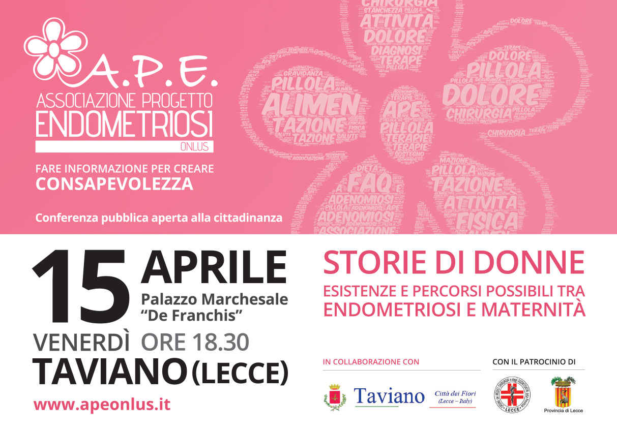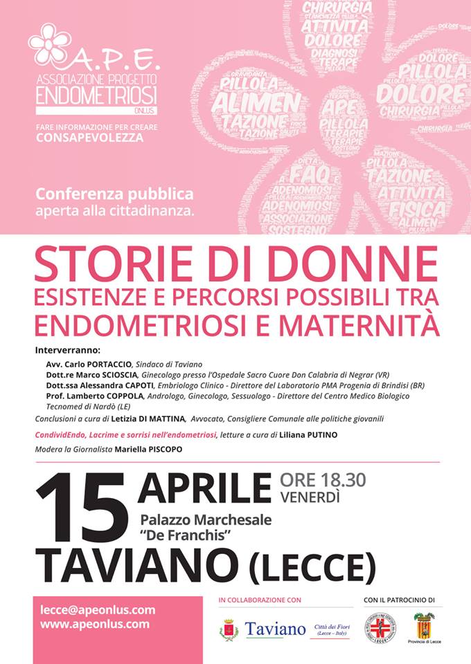 L'Associazione Progetto ENDOMETRIOSI onlus "fare informazione per creare CONSAPEVOLEZZA", con la collaborazione e il patrocinio del Comune di Taviano, venerdì 15 aprile 2016 ore 18.30, presso la sala "Armando Ria" palazzo marchesale "De Franchis", terrà una conferenza pubblica sul tema: "STORIE DI DONNE esistenza e percorsi possibili tra ENDOMETRIOSI E MATERNITÀ".La Cittadinanza è invitata a partecipare.