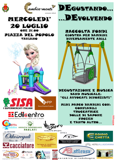 Nell'ambito del programma delle Manifestazioni Estive "TAVIANO | MANCAVERSA 2016", mercoledì 20 luglio p.v., con inizio alle ore ore 21, in Piazza del Popolo a TAVIANO, si terrà "DEGUSTANDO... DEVOLVENDO" raccolta fondi giostra per bambini diversamente abili. un evento organizzato dall'Associazione "Cambia-menti" con il patrocinio e il sostegno del Comune di Taviano, Assessorato alle Manifestazioni estive.Visualizza e/o scarica il manifesto dell'evento.