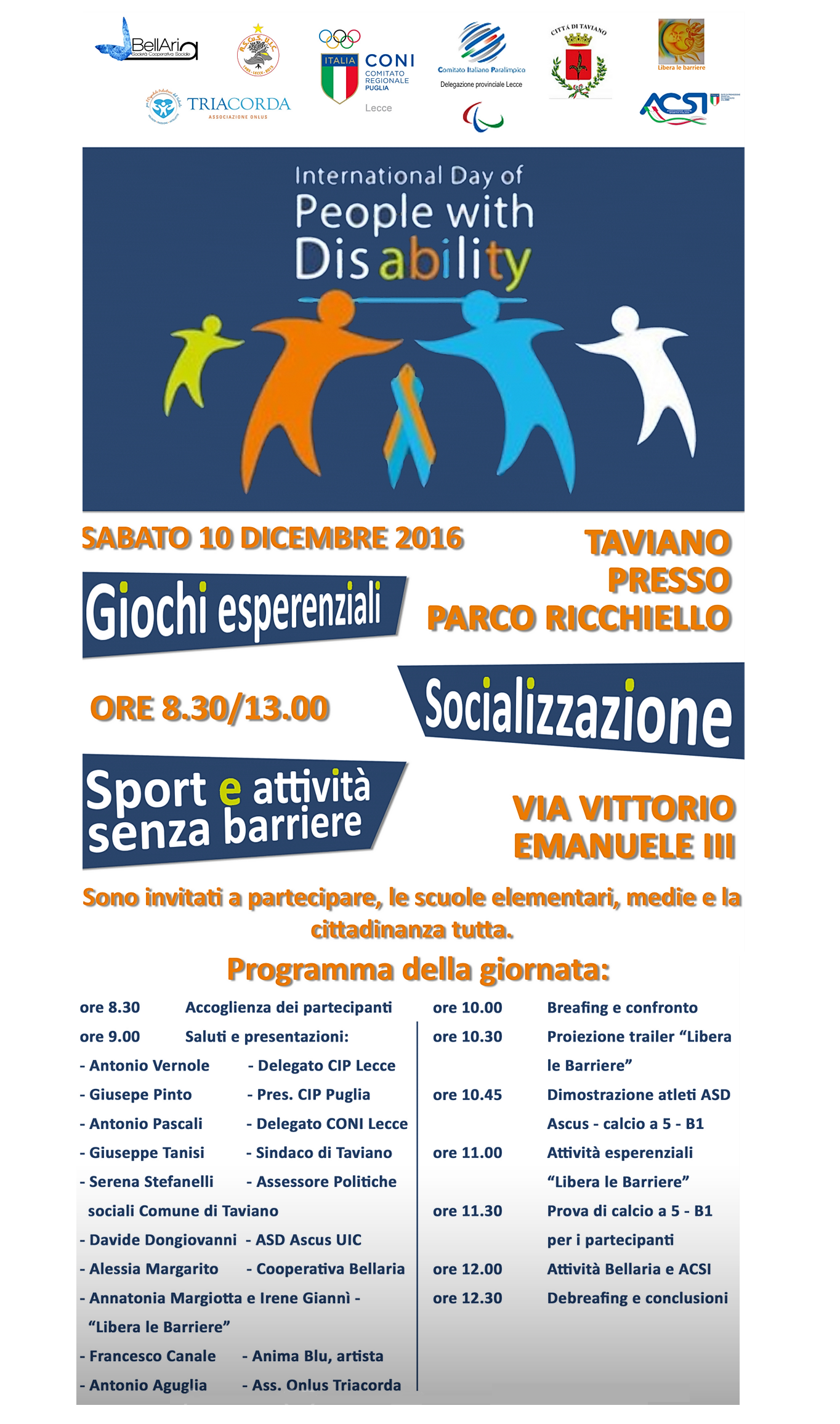 Il Comune di Taviano, Assessorato ai Servizi Sociali in collaborazione con CIP PUGLIA, CIP LECCE e CONI LECCE ospita la GIORNATA INTERNAZIONALE DELLE PERSONE CON DISABILITÀ