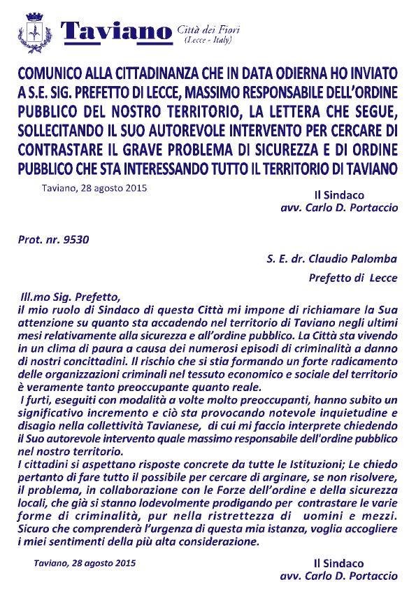 SICUREZZA e ORDINE PUBBLICO a TAVIANO: Il Sindaco scrive al Prefetto