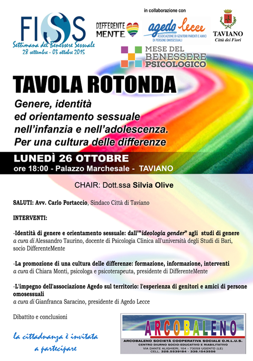 Lunedì 26 ottobre 2015 (ore 18.00) presso la sala polifunzionale "Armando Ria" del palazzo marchesale "De Franchis, TAVOLA ROTONDA sul tema: Genere ed orientamento sessuale nell'infanzia e nell'adolescenza. Per una cultura delle differenze. La Cittadinanza è invitata a partecipare.